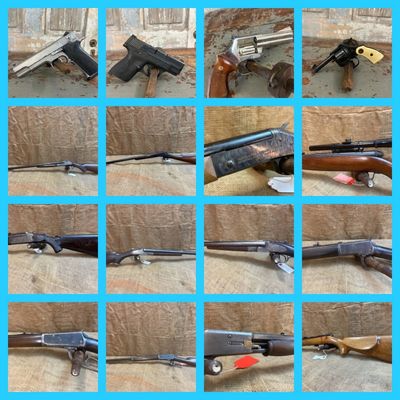 L.C. Smith Double Barrel 20 Ga. Featherweight, American Gun Co. 12 Ga Double Barrel, Bayard Arms 12 Ga. Double Barrel, Marlin 57 Lever .22, Western Field 12Ga. Trap, Stevens "Dreadnaught 12Ga. Trap, H&R 10 Ga. Model 1176 36" Single Barrel, 32Ga. Muzzleloader, H&R Medalist Target .22 Heavy Barrel, Remington 550-1 Semi .22, Marlin 75 Semi .22, Winchester 74 .22 Short, HSB Rolling Block Target .32 Long Centerfire, H&R Model 88 12 Ga. Single Barrel, Stevens Model 24 .22/.410 Over/Under, BSA Target .22, NEW FAS .410 - 870 Remington Copy, NEW Armsan Cobra .410 Vent Rib, NEW - Colt/Taurus Lightning .45, Colt Lightning .22 Long Rifle, NEW - Traditions Pursuit .50 Cal Ready Pak Shooter, Marlin Model 25 .22 Long Rifle Needs Clip, Winchester 1894 Octagon Barrel .30 WCF, WINCHESTER 1892 Octagon Barrel .32-20, L.C. Smith Feather Lite 20 Ga. Double Barrel, 3 - Remington 1100 12 Gauges, Marlin .22 Stainless Model 60, SHINKOSHA .410 3" Chamber Model SB6, Boito 12 Ga, 26" Double Barrel Shotgun, Remington Sportsman 48 12 Ga, Stevens 12 Ga Model 67 Series E 28" Barrel, Marlin 30-30 Model 3040 JC Penny with Glenfield 4x32 Scope, Winchester .22 Long Rifle Model 74, Marlin .22 WMR Model 883 with Tasco Scope, Browning BL-22 .22 Long & Short, Remington Woodmaster 30-06 Springfield Model 742, Browning BAR 30-06, Glenfield .22 Long Rifle Model 75, Stevens/Savage .410 3" Chamber Single Shot Model 1073 Marked LV on 26" Barrel, Remington 243 Model 7400 Winchester 243, Browning Medallion A Bolt 7MM Remington Mag Only with Tasco Scope, Marlin JC Penny Model 3040 30-30 Winchester, Smith & Wesson 367 Magnum Model 586, Smith & Wesson .45 Automatic Model 4506-1, Smith & Wesson M&P 9MM, ROHM (German).22 Short, National Arms CO. .38, Galco Handmade USA Leather Gun Belt, Vintage BB/Pellet Rifle Unknown Maker, Marlin Cowboy Single Cock .177 Cal. BB Air Rifle